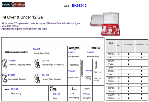 -Kit includes 27 top needed parts for repair of Beretta Over & Under shotgun series 680s 12 Ga.