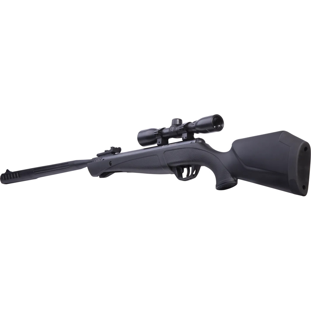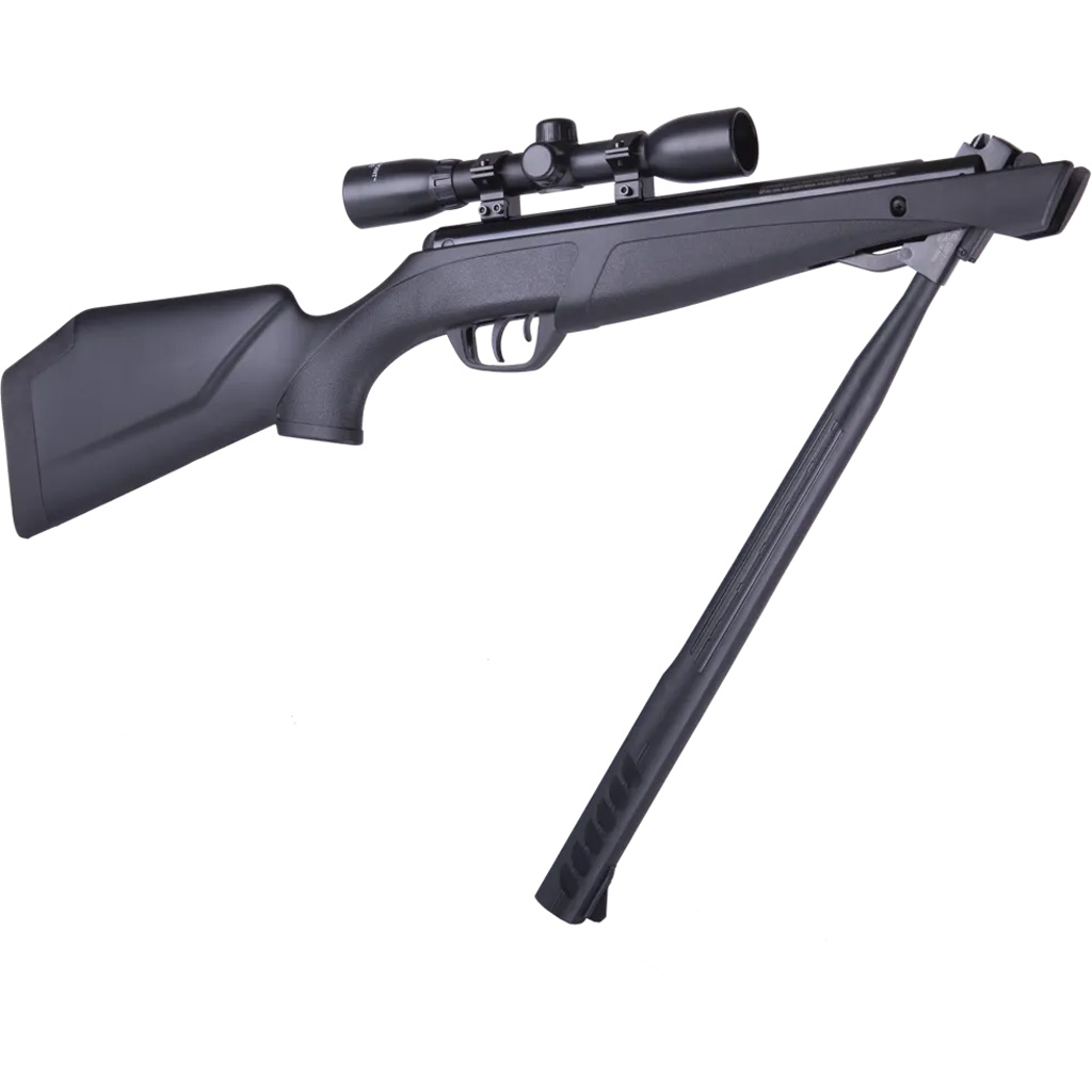 The Crosman Shockwave is a break barrel air rifle built around Nitro Piston technology for smooth cocking, reduced recoil, and consistent performance. QuietFire sound suppression helps reduce report, with up to 70 percent less noise than others in its class. It features an all-weather synthetic stock, a rifled steel barrel, and a two-stage adjustable trigger for controlled shot release. A 4×32 scope is included to support precise aiming at distance, with velocities up to 1200 fps in .177 caliber.