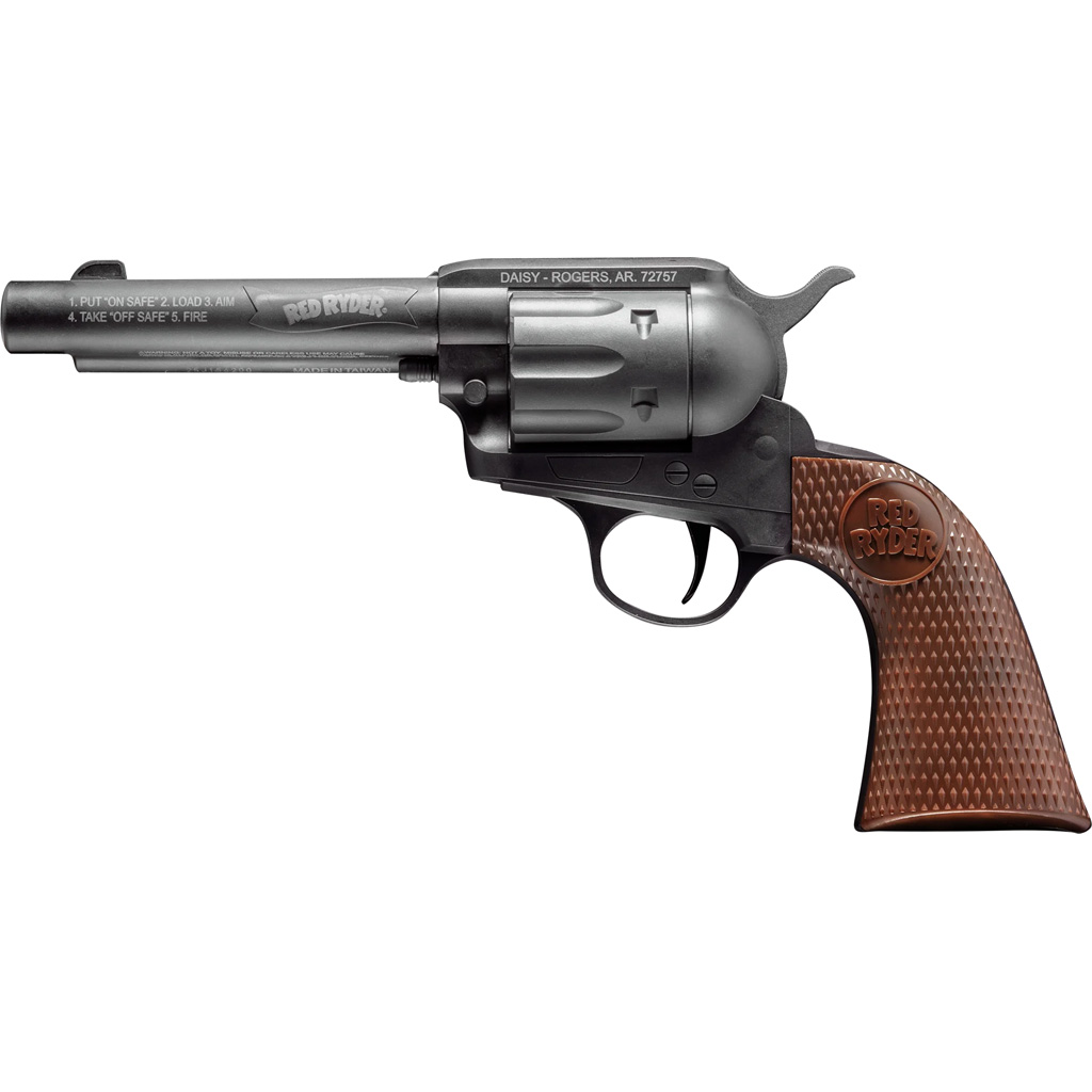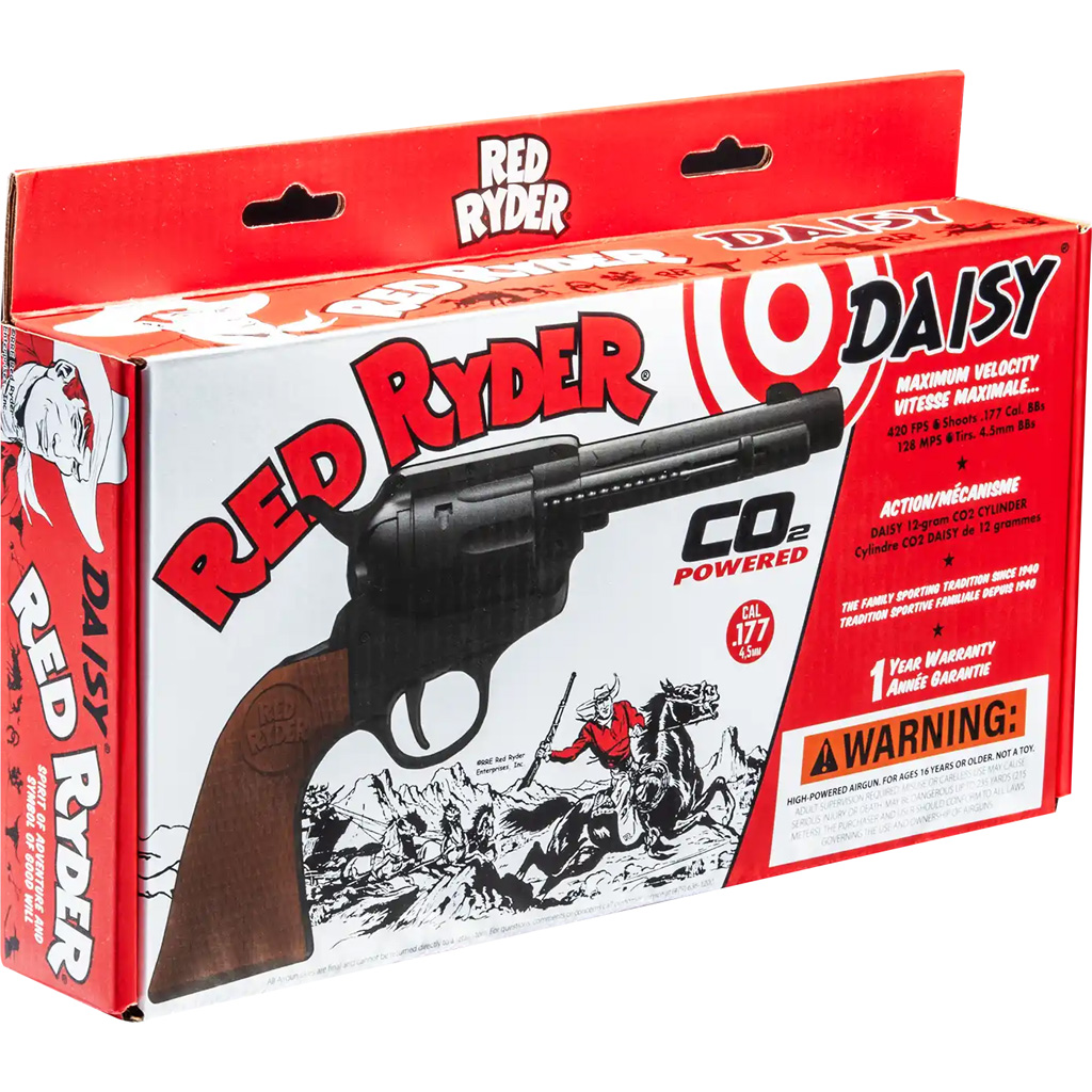 The Daisy Red Ryder revolver is a CO2-powered .177 BB air pistol that blends classic styling with straightforward single-action operation. It delivers velocities up to 420 fps with steel BBs and uses an 18-BB reservoir to reduce reload frequency. A smooth bore steel barrel and fixed sights provide simple, consistent handling for casual range sessions. Compact dimensions and a manual safety round out a practical, easy-to-run platform.
