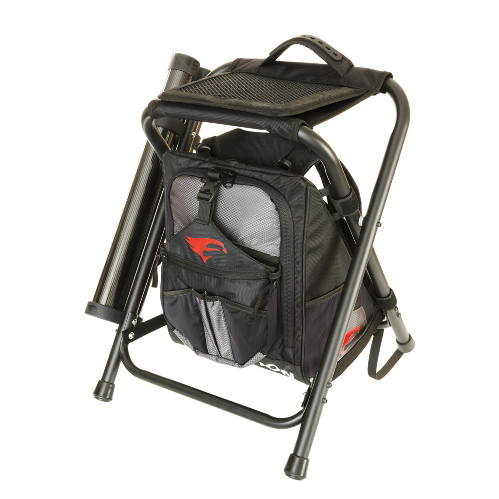 The Elevation Shooter Stool features two, 2″ tubes with rubber point plates inside the bottom and rubber end caps to keeps arrows protected and at the ready. The quiver attachment can easily transition to either side of stool per shooter preference. Dressing the 300lb rated frame is a detachable pack with ample storage for tournament trail accessories and a seat with fold away pad.