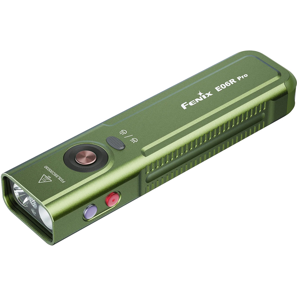 The Fenix E06R PRO is a flat-bodied EDC flashlight delivering up to 1600 lumens in Instant Turbo with combined spot and flood beams. It features white light, UV light, and a red laser, along with a 3D light ring offering five lighting effects. Powered by a built-in 1650mAh battery, it provides up to 111 hours of runtime and recharges via USB Type-C. Dual-switch control, battery level indication, and IP66-rated protection support dependable daily carry.