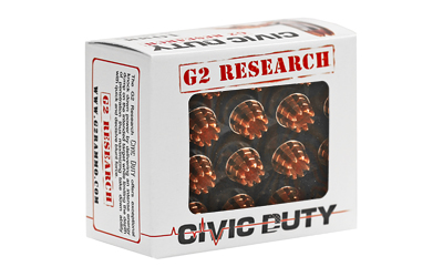 Typical bonded hollow point bullets over penetrate, leading to insufficient energy transfer, damage and trauma inside the intended target. G2 Research has taken its innovative Trocar design of the solid copper R.I.P. fragmenting projectile and adapted it to the G2 Research Civic Duty expanding self-defense round. The Civic Duty round defeats barriers as effectively as the R.I.P. and expands 2.5 times its initial diameter after coming into contact with a fluid medium. The Civic Duty round expands to transfer 100 Percent of its energy to the target. The Civic Duty Round retains 99.9 Percent weight inside the intended target without concern of over penetration in CQB situations.