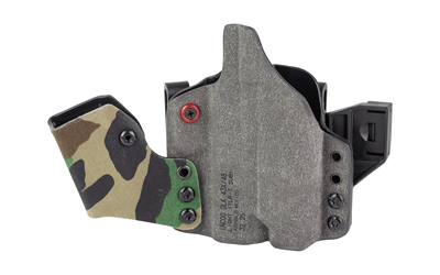 An ergonomic, mission-adjustable, RDS-compatible, multi-positional, deep concealment IWB hybrid thermoplastic holster. Its distinctive features enable concealed carry for a wide range of handgun fits from various carry positions while allowing a full firing grip prior to drawing. The design includes passive retention and adjustable tension, enabling a finely tuned fit and smooth draw. This evolution of the IncogX features a series of clips that provide more adaptability to the user while maintaining the original goals of improved grip, concealment, and function. The clips open outward and slide down with the holster, naturally locking over the belt. An actuated finger tab flexes to open, allowing quick installation or removal from the belt. An improved clip strut design combines functionality with customized concealment shims that can be easily installed or removed without tools. All IncogX models come with clip strut shims in three different concealment sizes: 1/8″, 1/4″, and 3/8″.